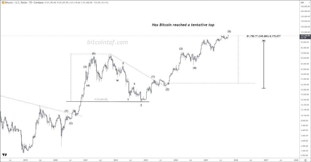 From the 2022 bear market low around $15,600, Bitcoin completed a clean five-wave impulse move to the current region near $121,000. That’s a 345% gain. Each segment of the chart aligns with the classic Elliott Wave pattern.
